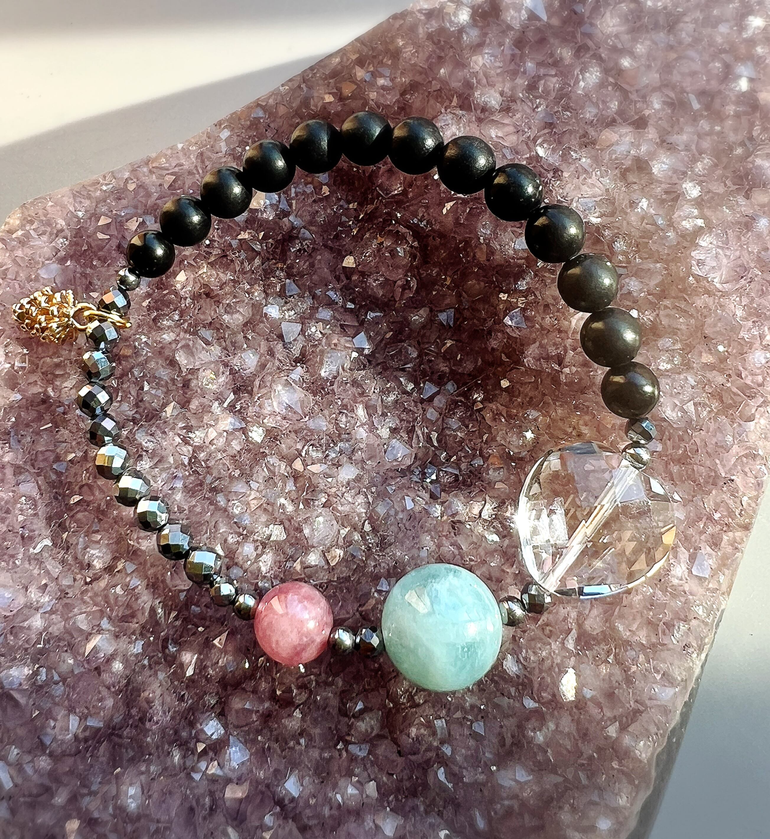 『3月の誕生石アクアマリン×ローズクォーツ×水晶×シュンガイト×テラヘルツ×ブラックシリカ』ブレス