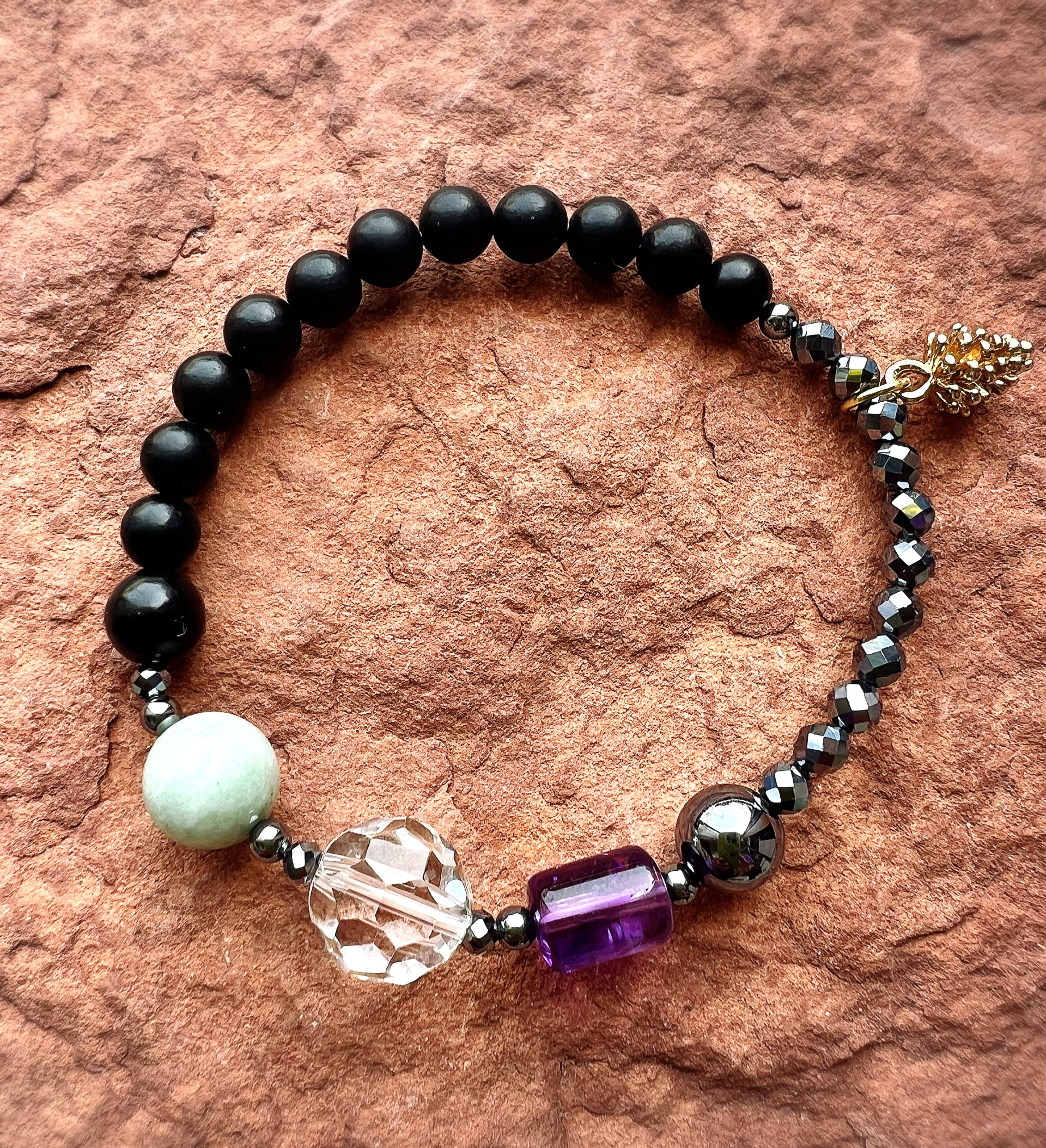 5月の誕生石翡翠×2月の誕生石アメジスト×バッキーボールカット水晶×シュンガイト×テラヘルツ×ブラックシリカ【電磁波対策&健康ブレスレット】