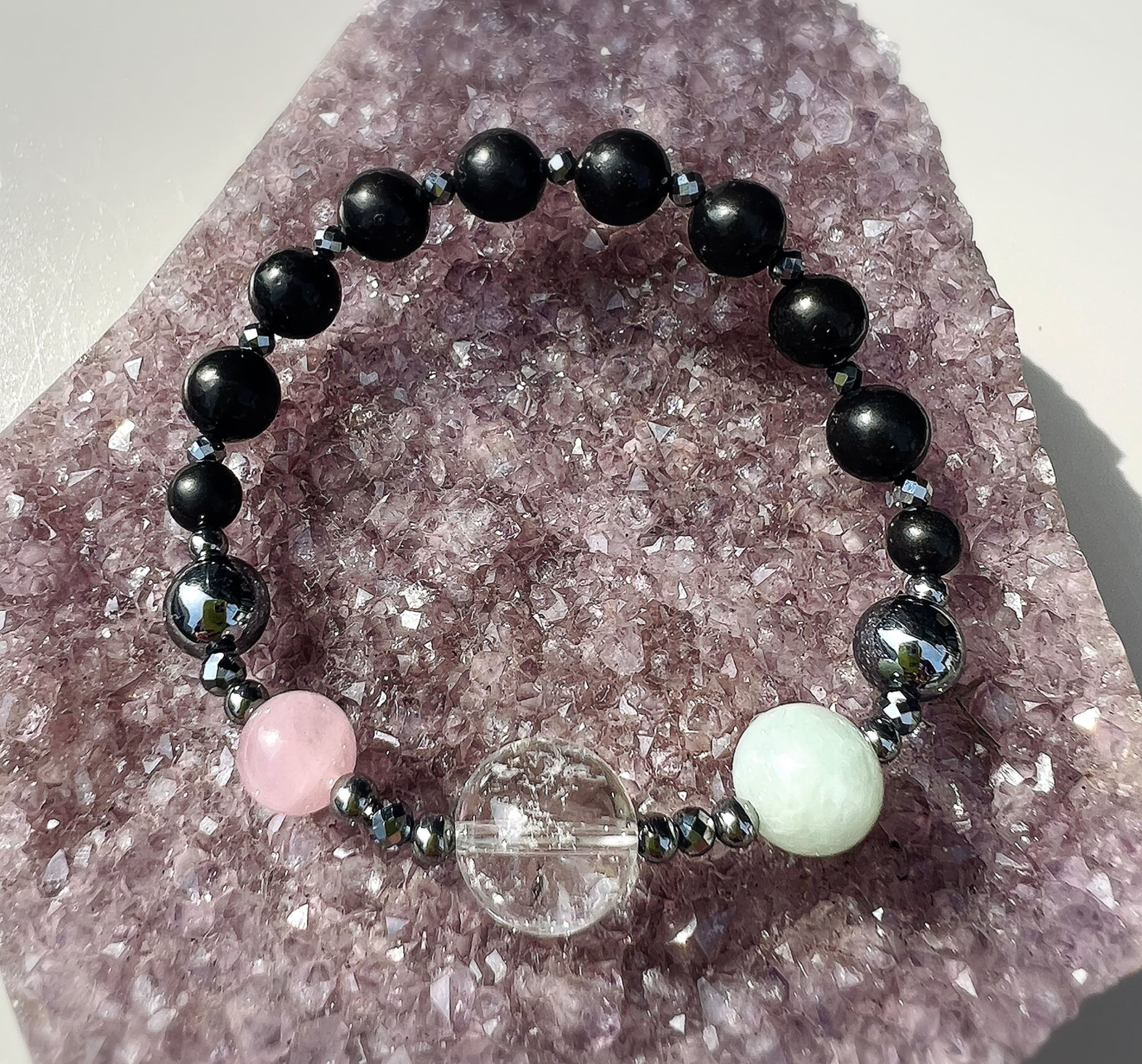 5月の誕生石翡翠×ローズクォーツ×ヒマラヤ産アイスクリスタル×シュンガイト×テラヘルツ×ブラックシリカ【電磁波対策ブレス】