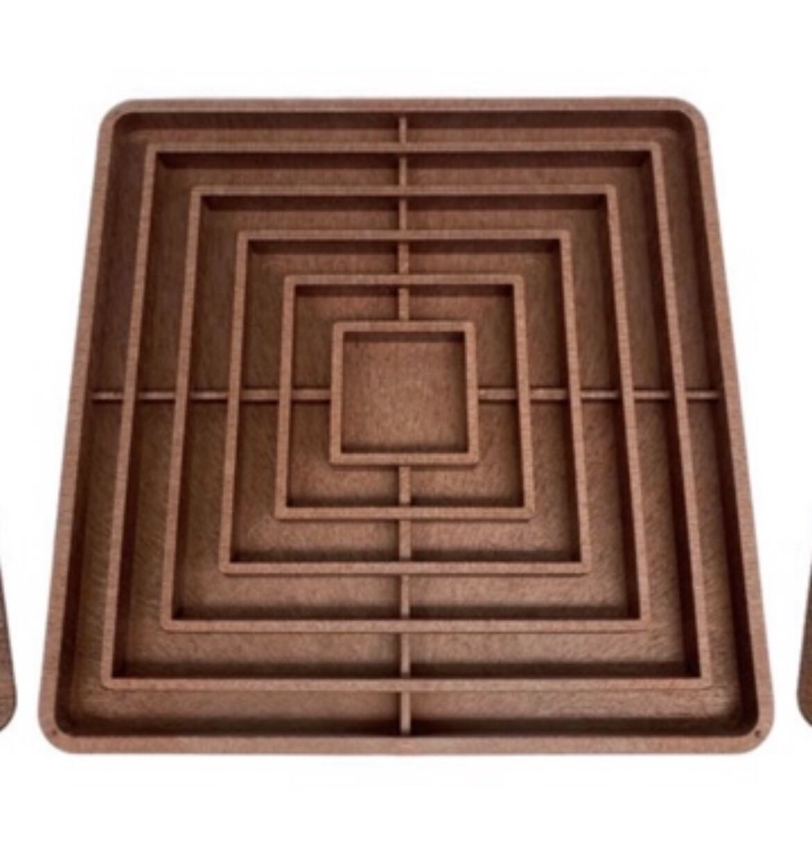 非常にシンプルな形状をしているこの商品は、一見だだのコースターにしか見えません 形状は見ての通り形の基本である「四角形」をしています。四角形はビル、学校、住居などですが、その中で活動すると集中力が高まって仕事、作業、勉強の効率が上がるのです。開発の目的は、コースターの上(スペース)に色々な「もの」を乗せて楽しむために考案されたものです。さらに、コースターを住居の土地の四隅に埋設しますと、土地、住宅、家具、食物、植栽、そして人のバランスを改善することが出来ます。