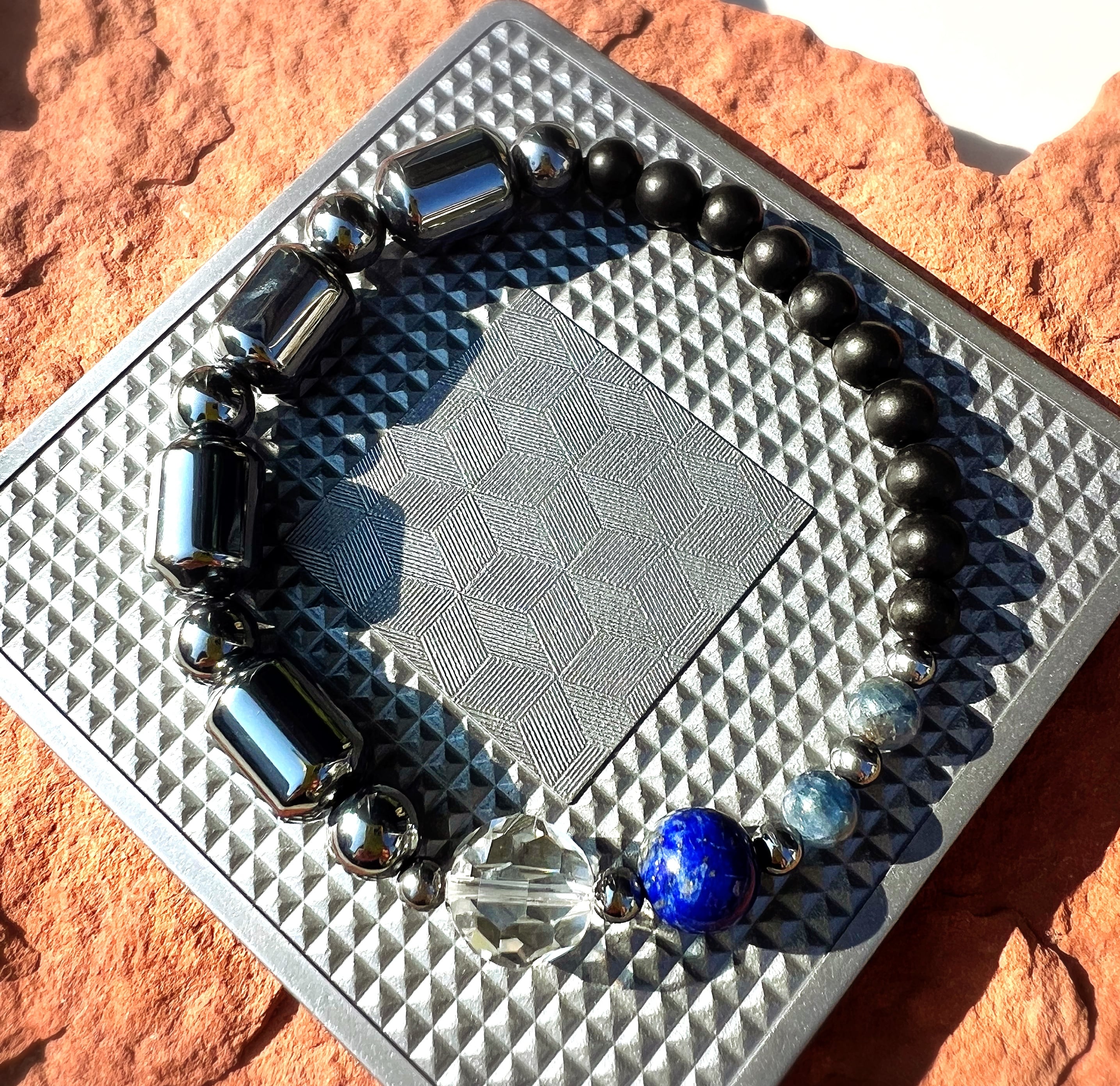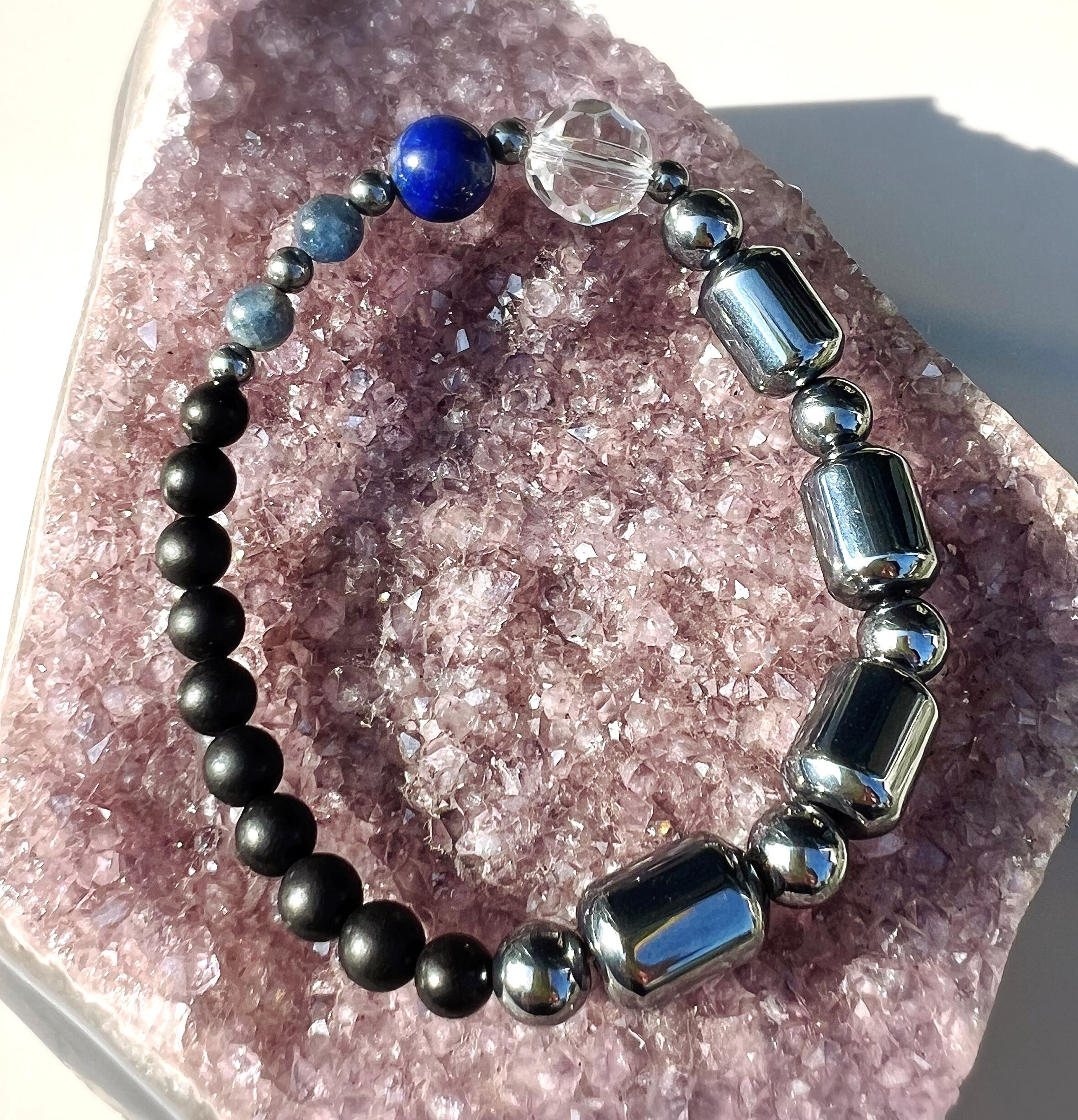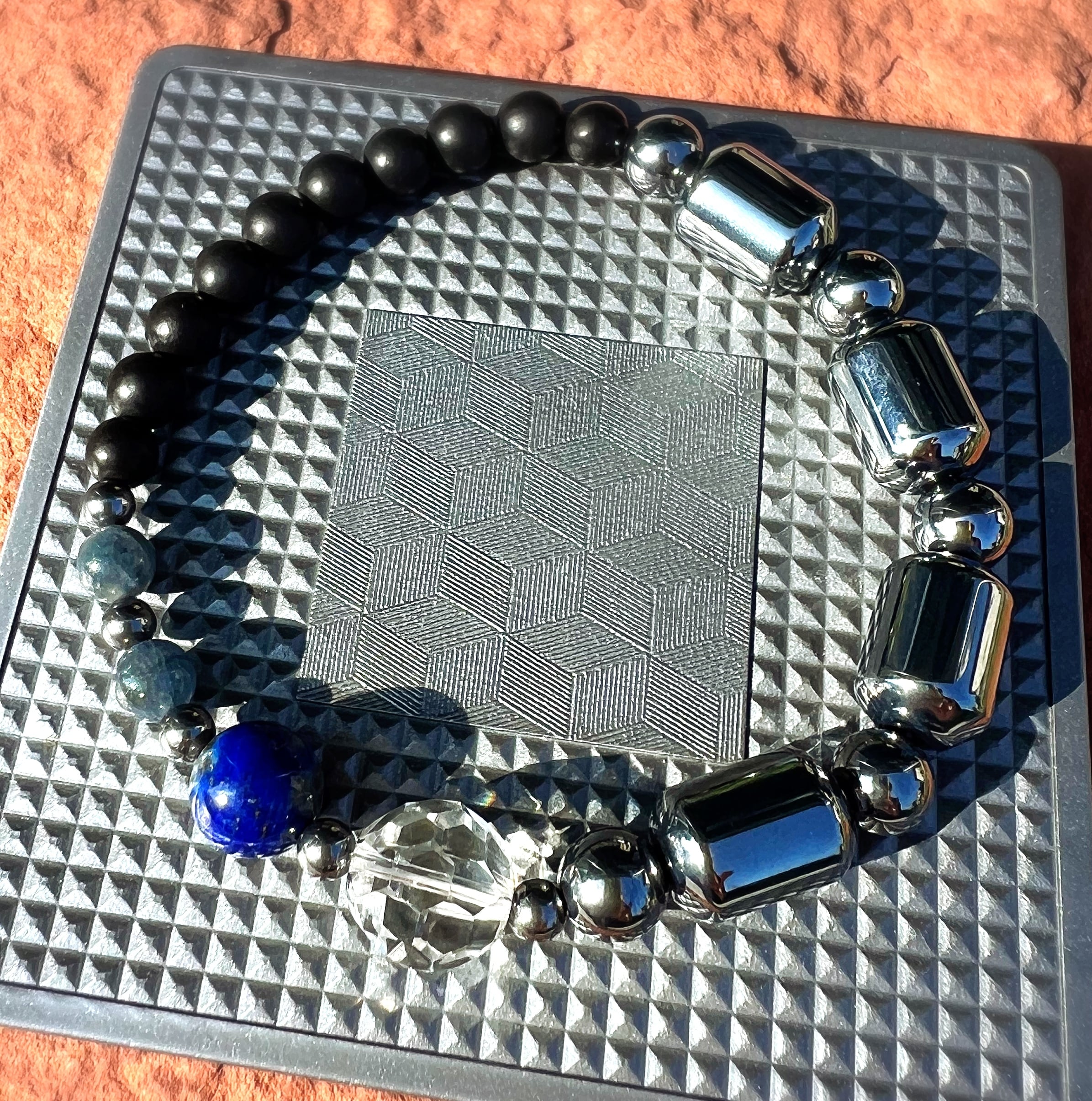9月の誕生石サファイア×ラピスラズリ×水晶(バッキーボールカット×ブラックシリカ×シュンガイト×テラヘルツ【電磁波対策健康ブレスレット】
