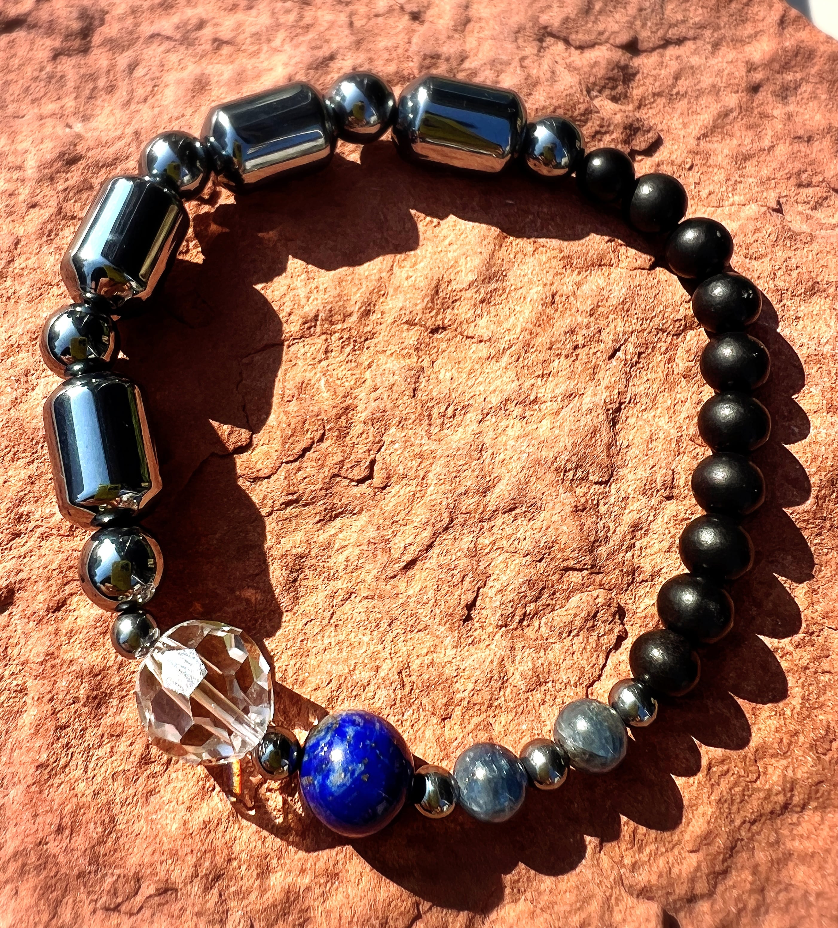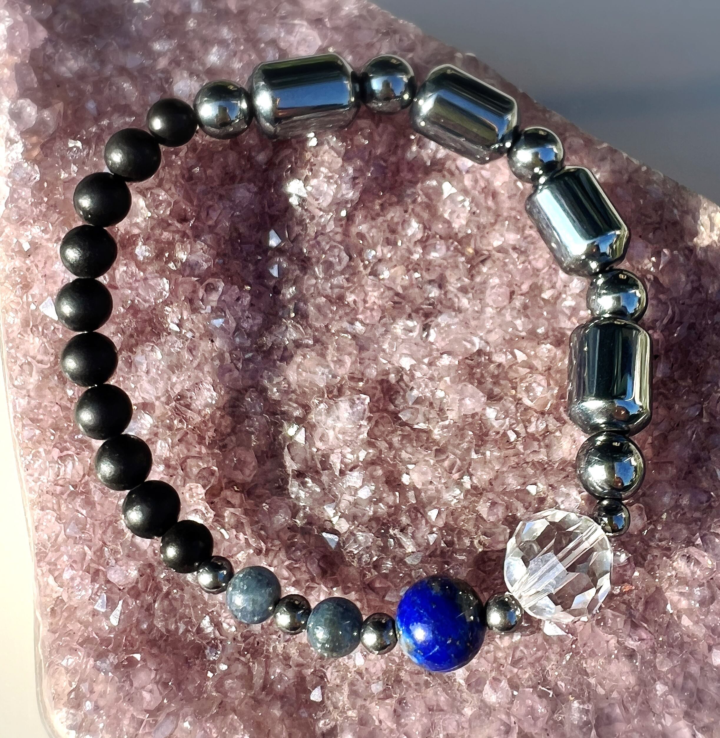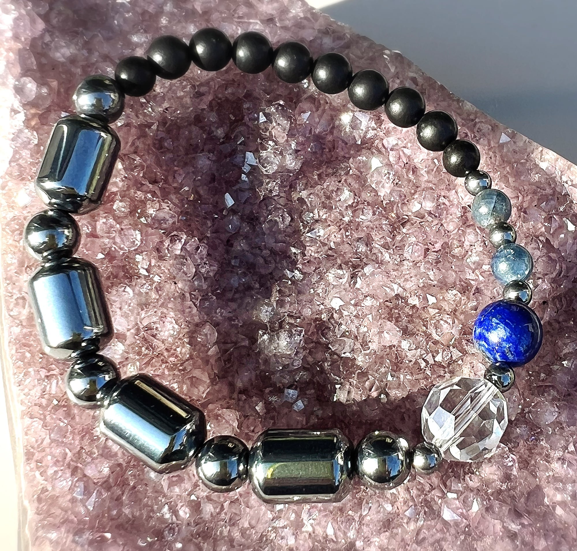 9月の誕生石サファイア×ラピスラズリ×水晶(バッキーボールカット×ブラックシリカ×シュンガイト×テラヘルツ【電磁波対策健康ブレスレット】