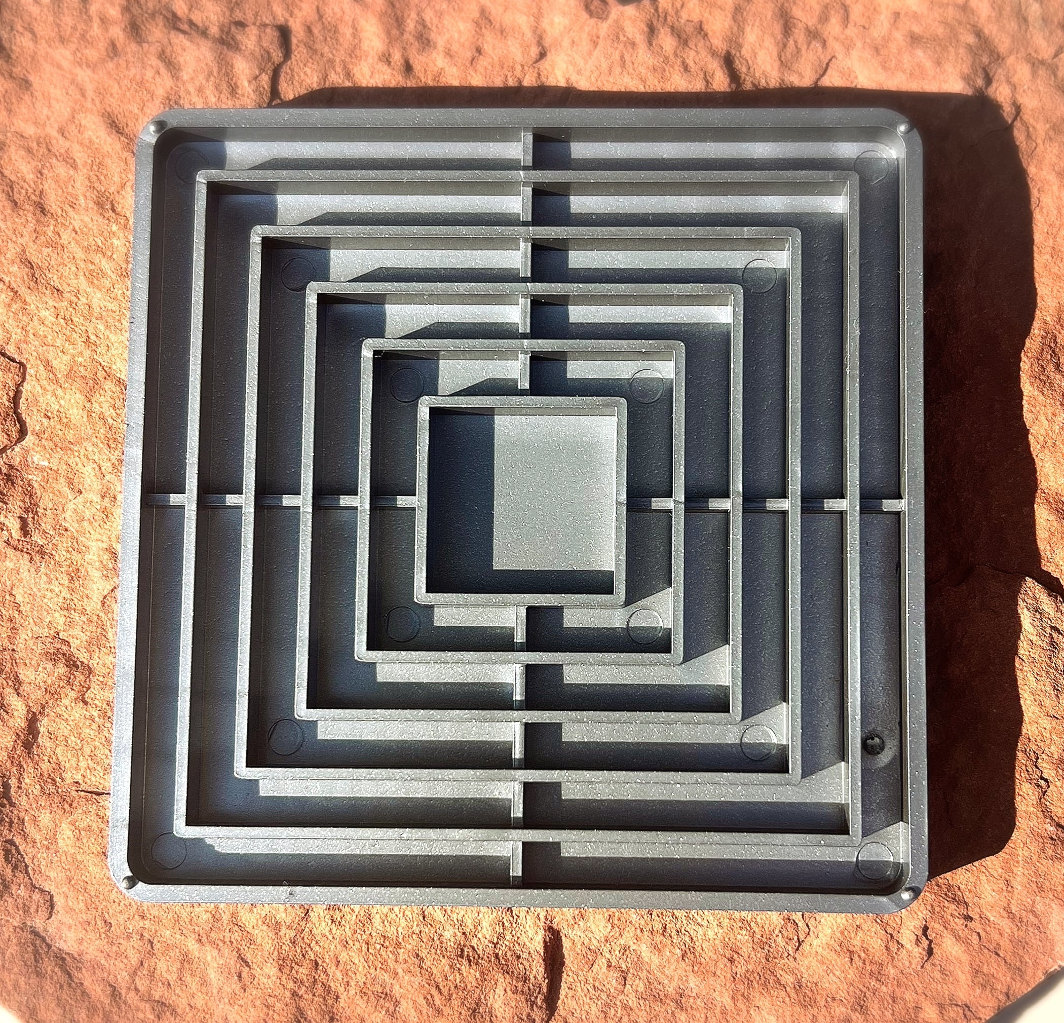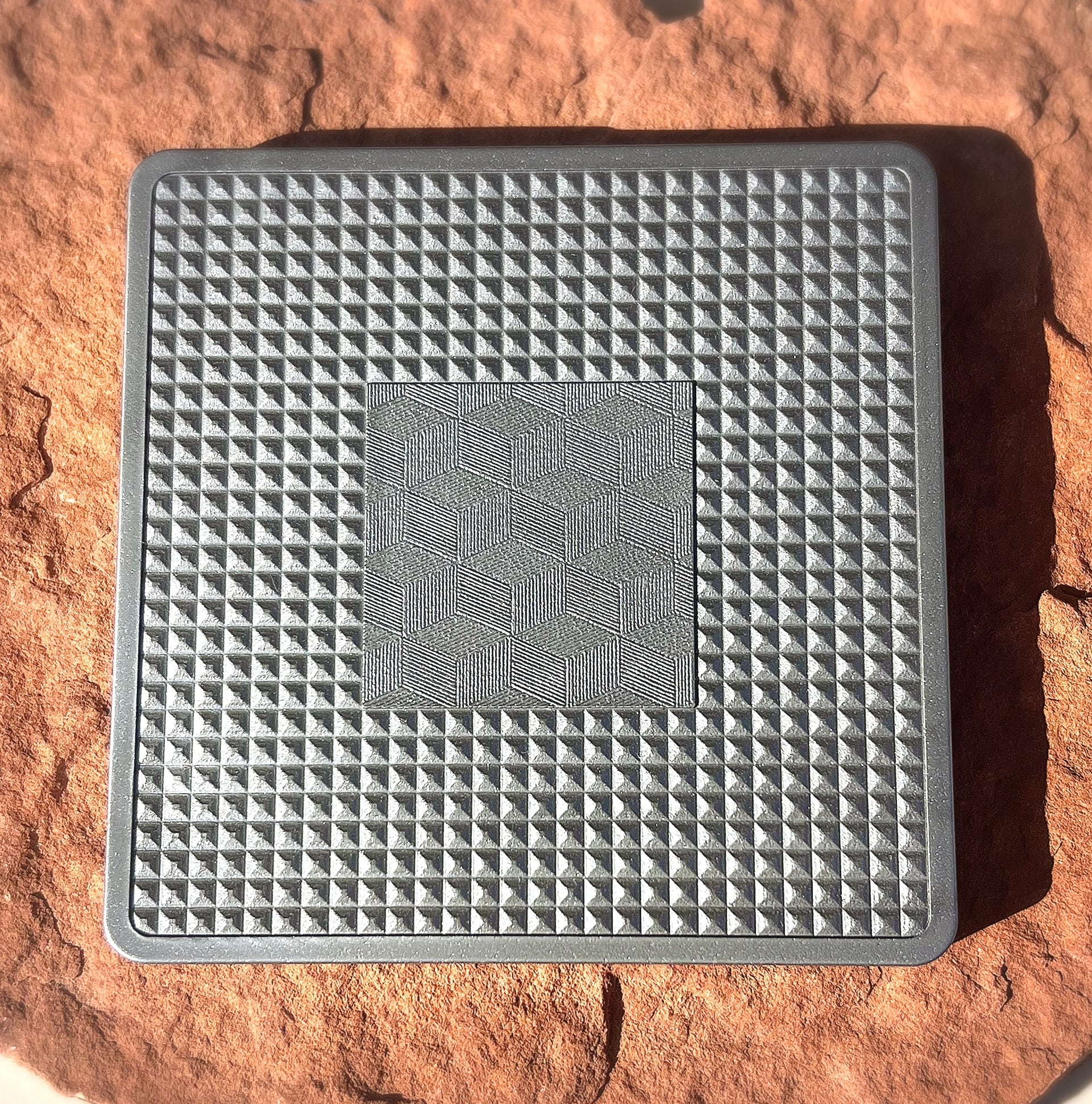 スペースコースターの姉妹品で、変わった模様が自慢です。この形状も四角形ですが、模様には縦横に小さなピラミッドが780個刻まれています。標準的なスペースコースターと違って、個性あるデザインとしました。活性酸素が過剰となった環境ではアンバランスな環境が発生します。自然破壊、河川や湖沼の汚染、排気ガス、土壌汚染、海洋汚染などは活性酸素が過剰となり微生物が減少したアンバランスな状態です。