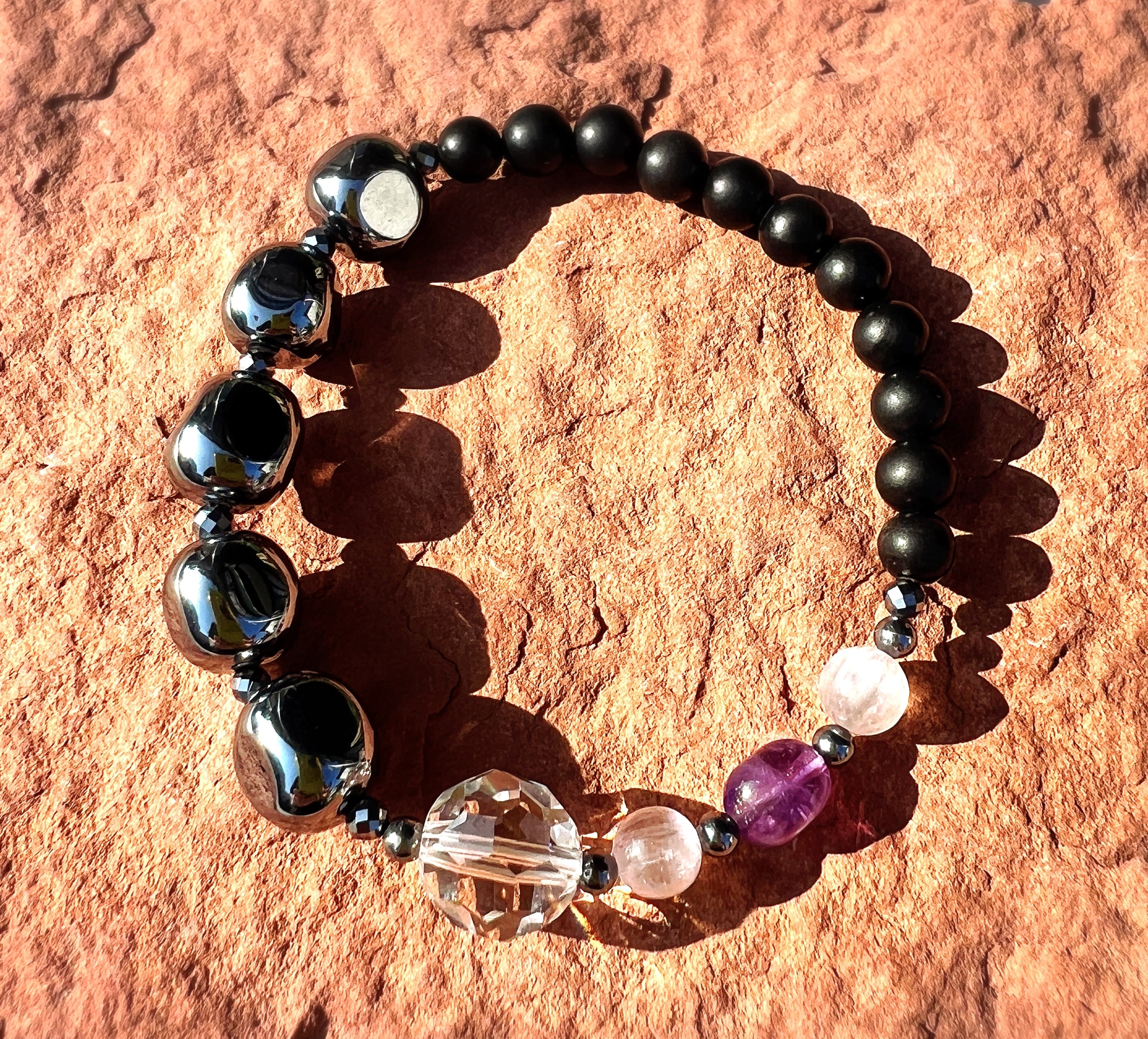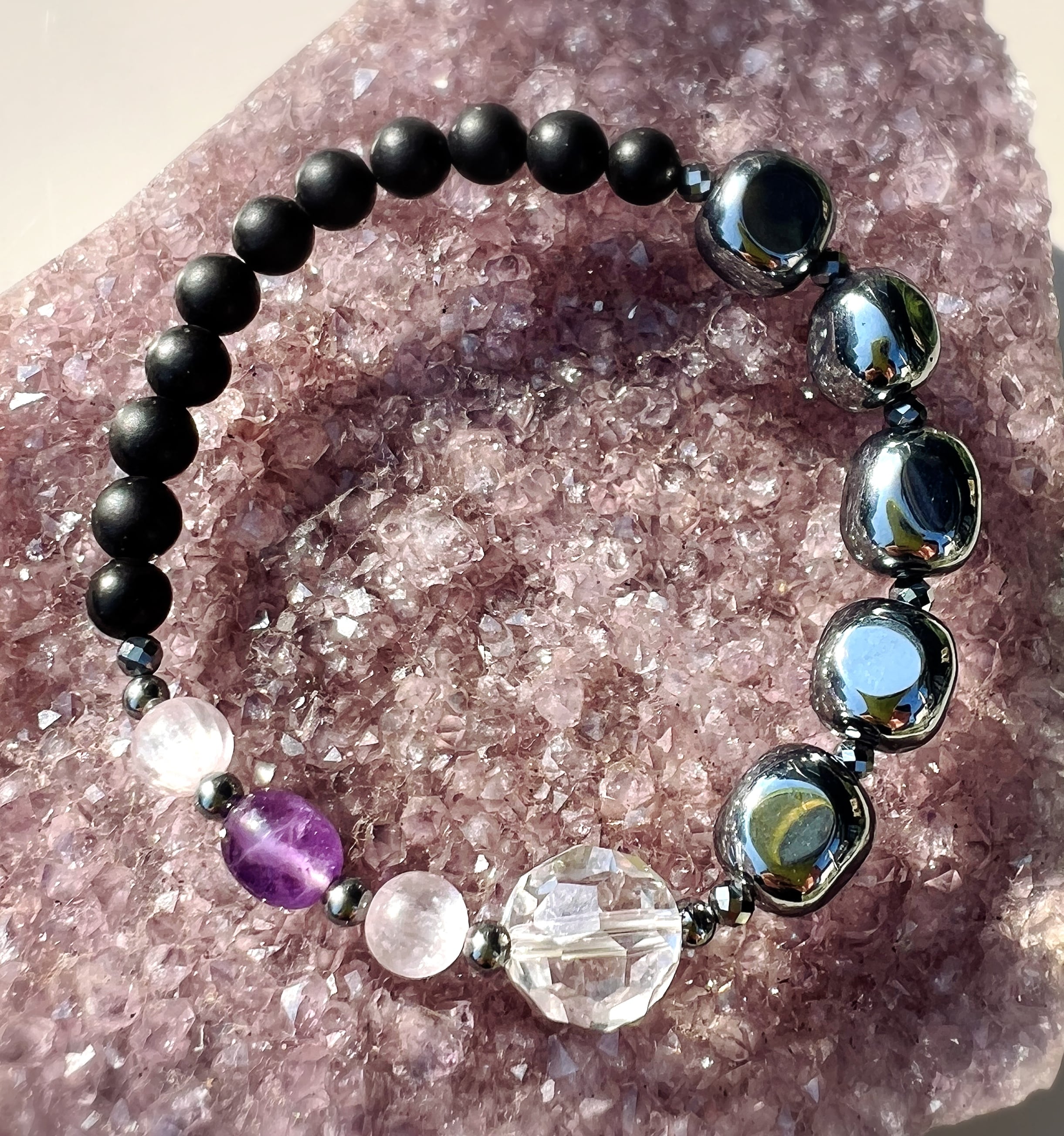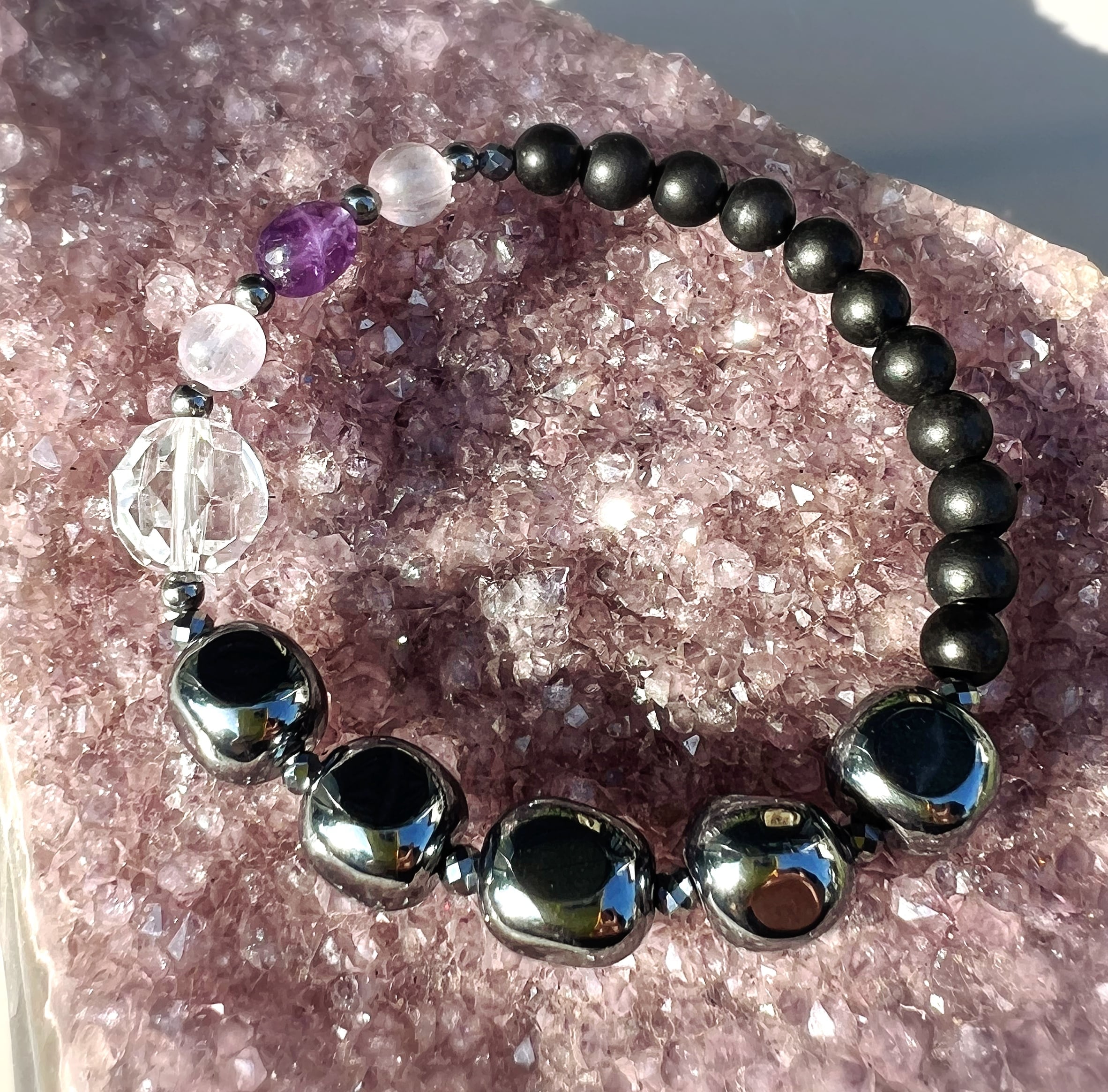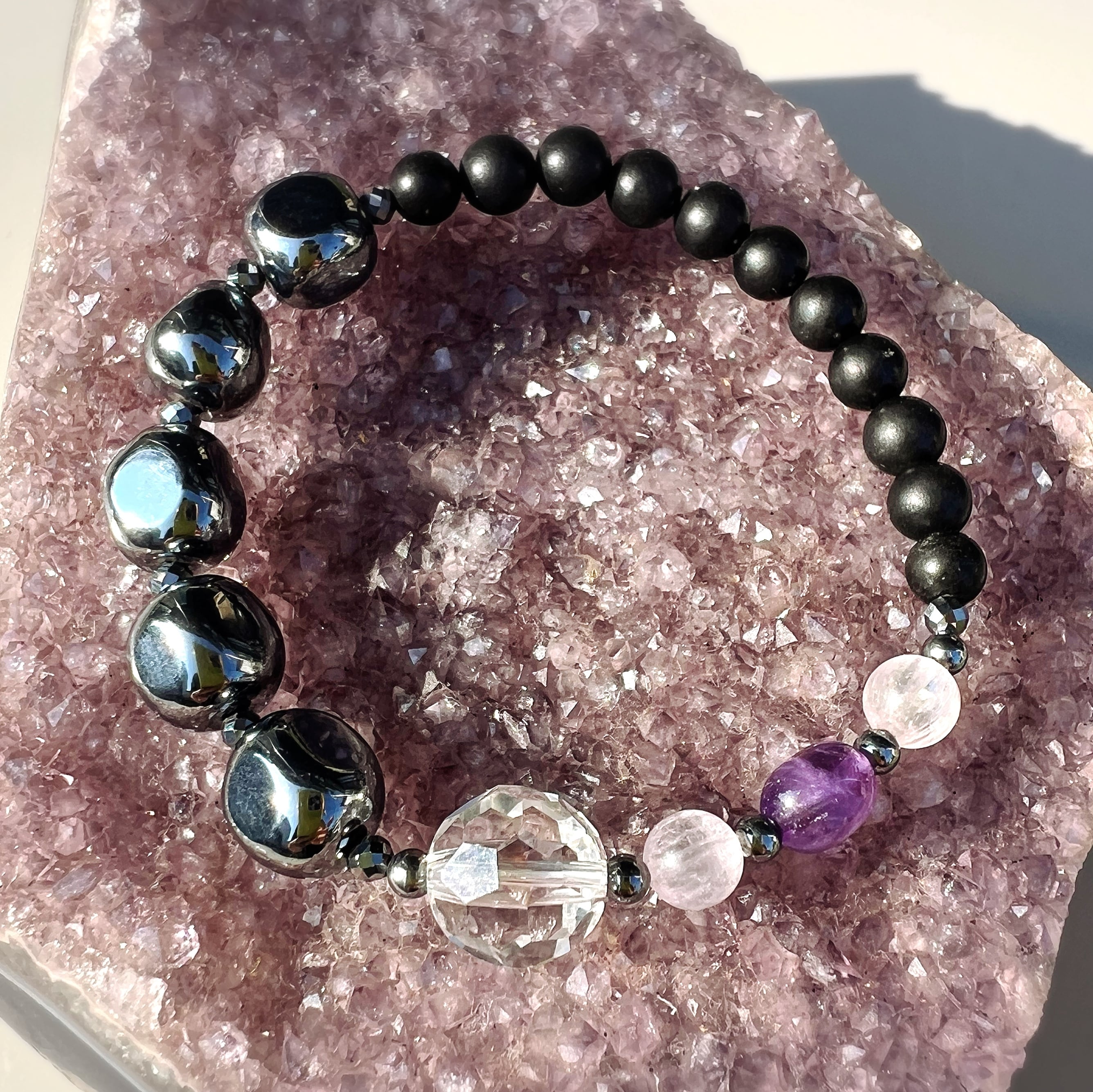 9月の誕生石クンツァイト×2月の誕生石アメジスト×ヒマラヤ産アイスクリスタルシュンガイト×テラヘルツ【電磁波対策健康ブレスレット】