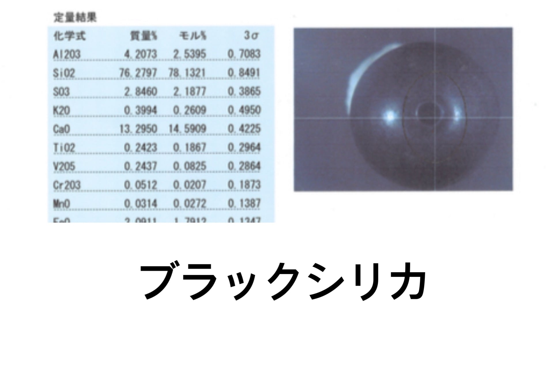 こちらは任意粒を成分分析鑑定済、 結果ブラックシリカの主成分である二酸化ケイ素(SiO2)が76%認められました。