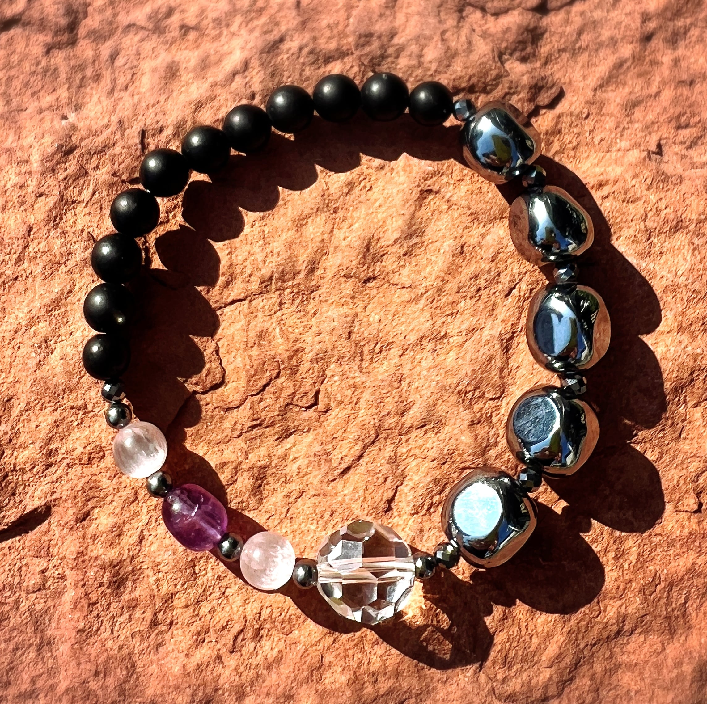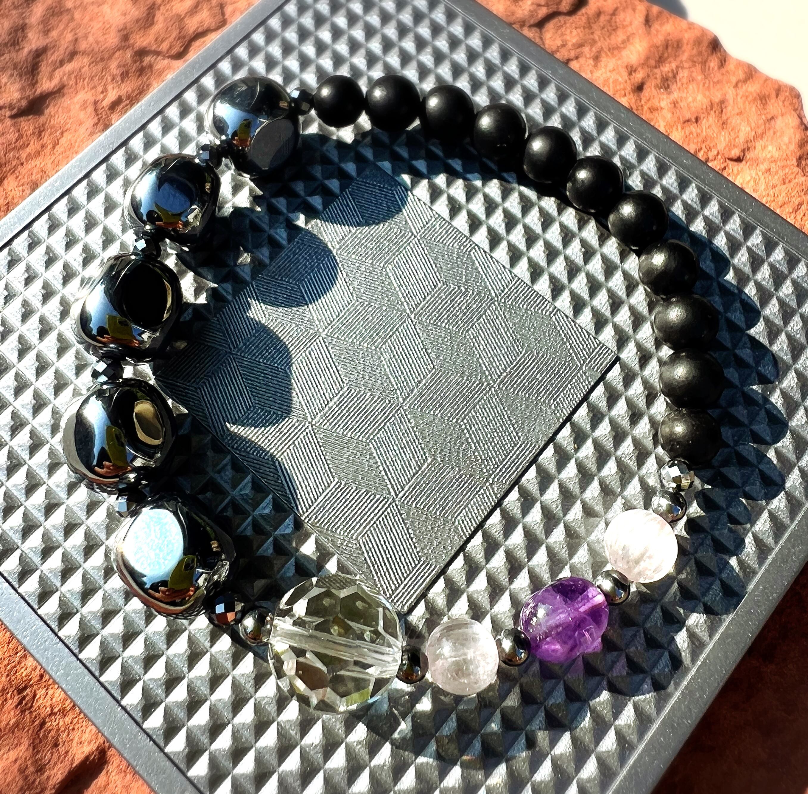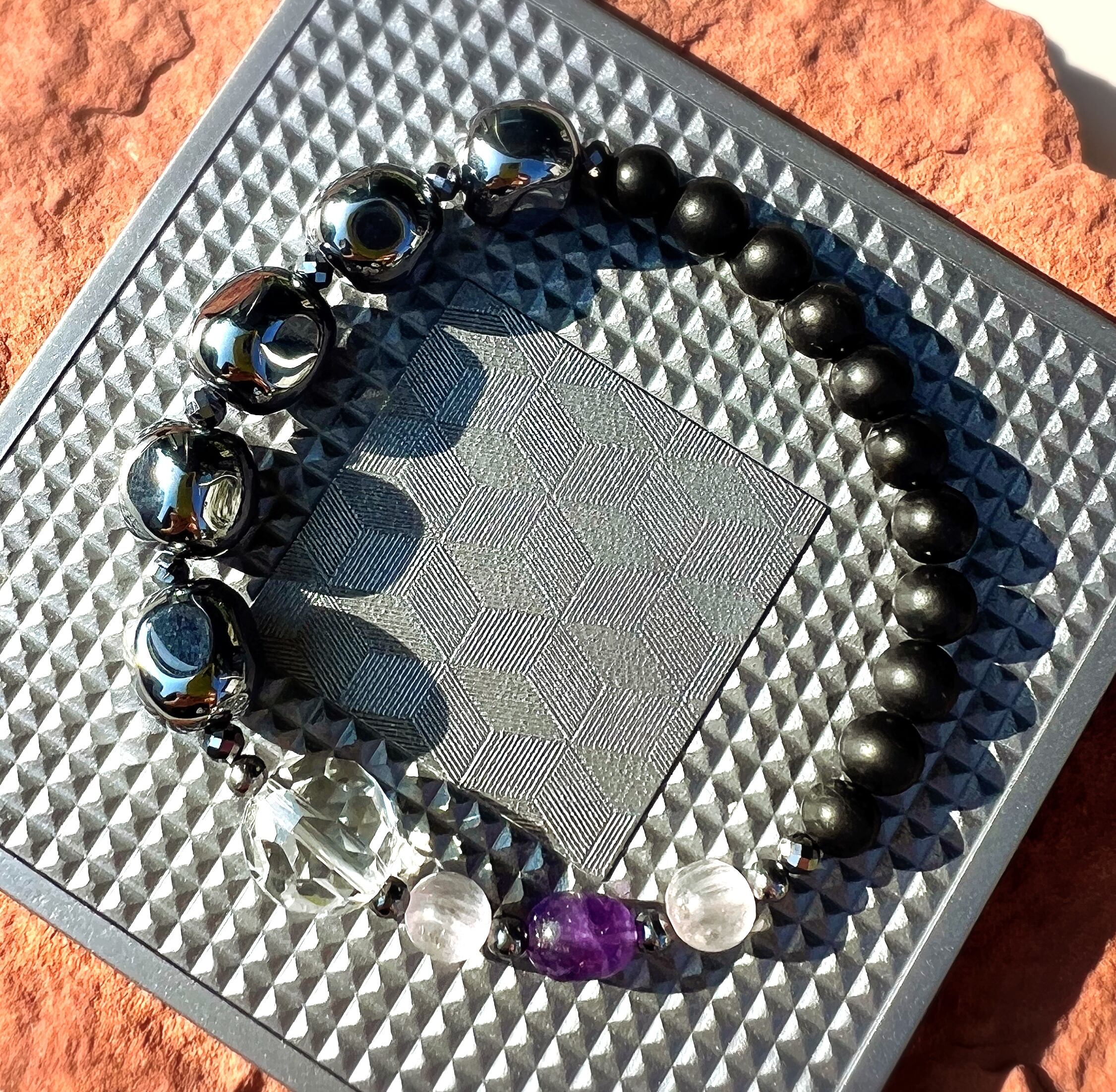 健康石としても大人気の『テラヘルツ鉱石』と、電磁放射線を遮る力があるといわれている希少石の『シュンガイト』を使用した【電磁波対策健康ブレスレット】です。