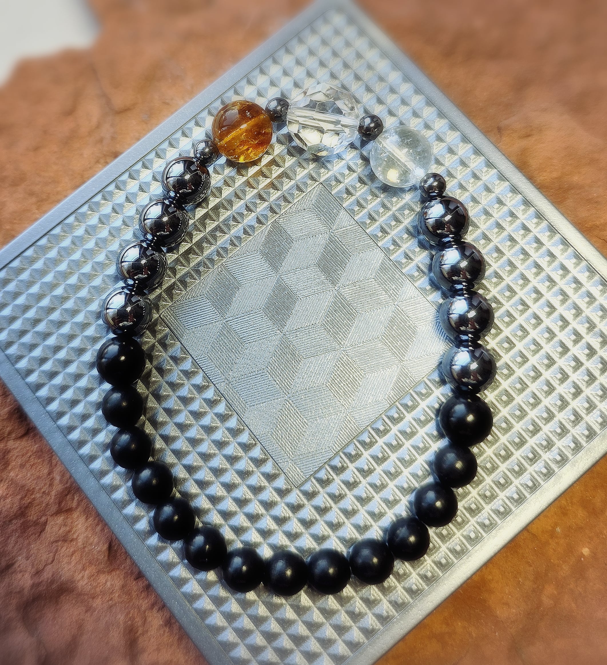 健康石としても大人気の『テラヘルツ鉱石』と、電磁放射線を遮る力があるといわれている希少石の『シュンガイト』を使用した【電磁波対策健康ブレスレット】です。