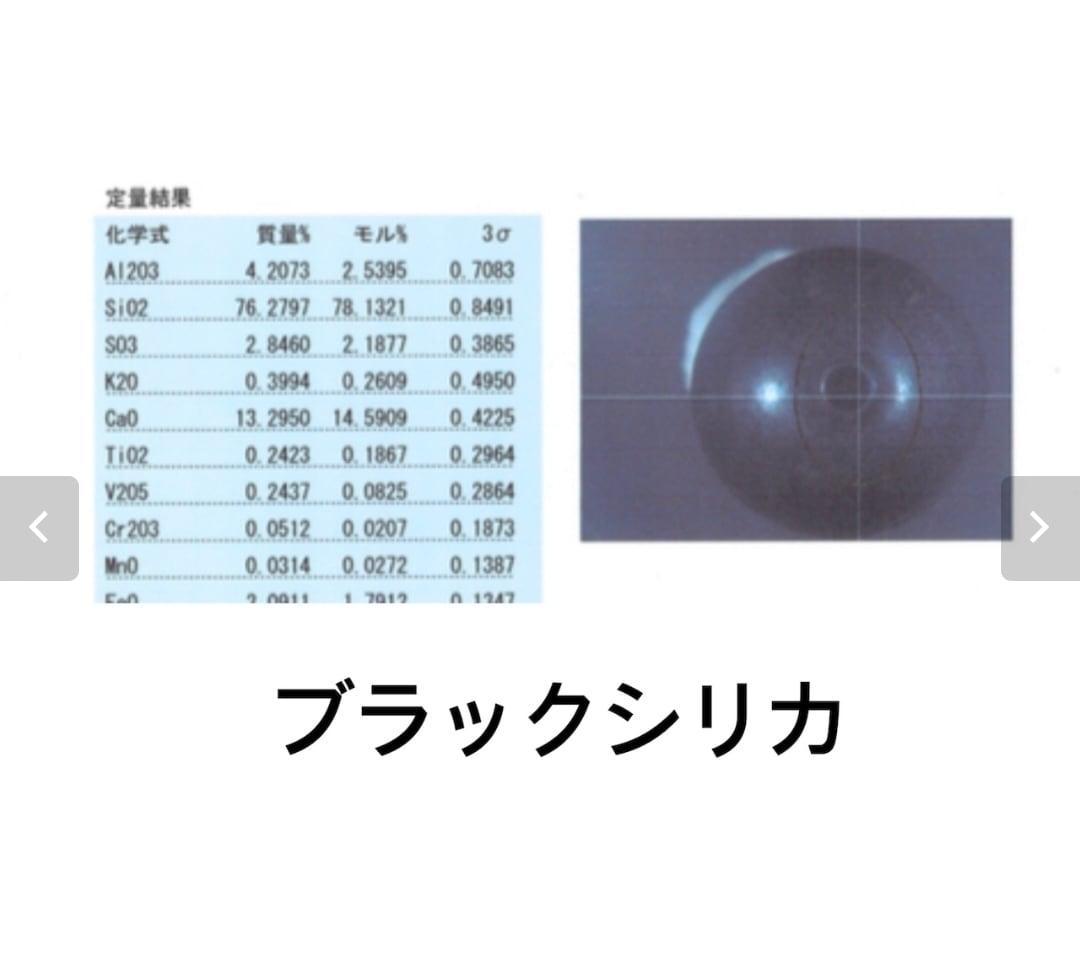 こちらは任意粒を成分分析鑑定済、 結果ブラックシリカの主成分である二酸化ケイ素(SiO2)が76%認められました。