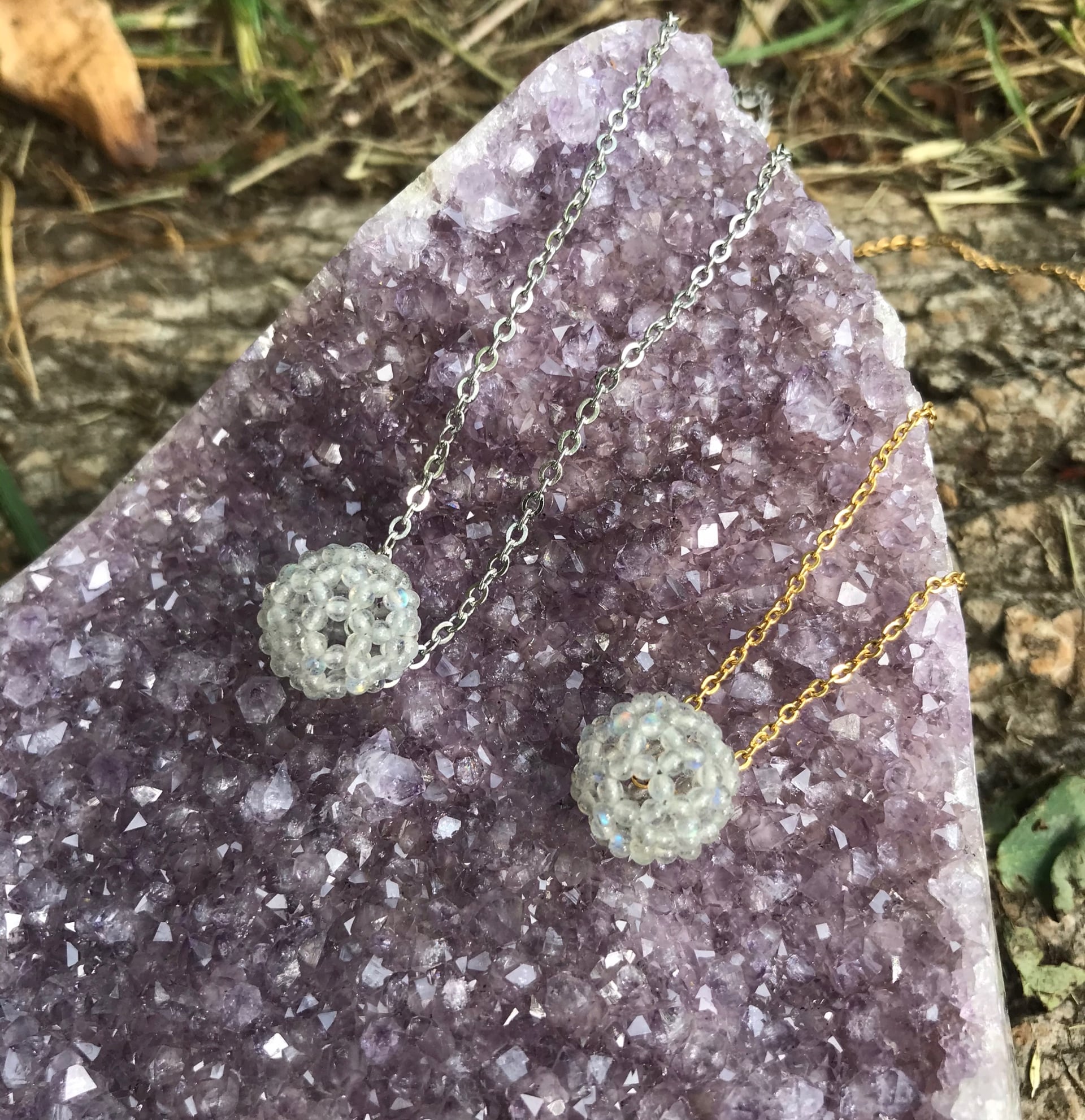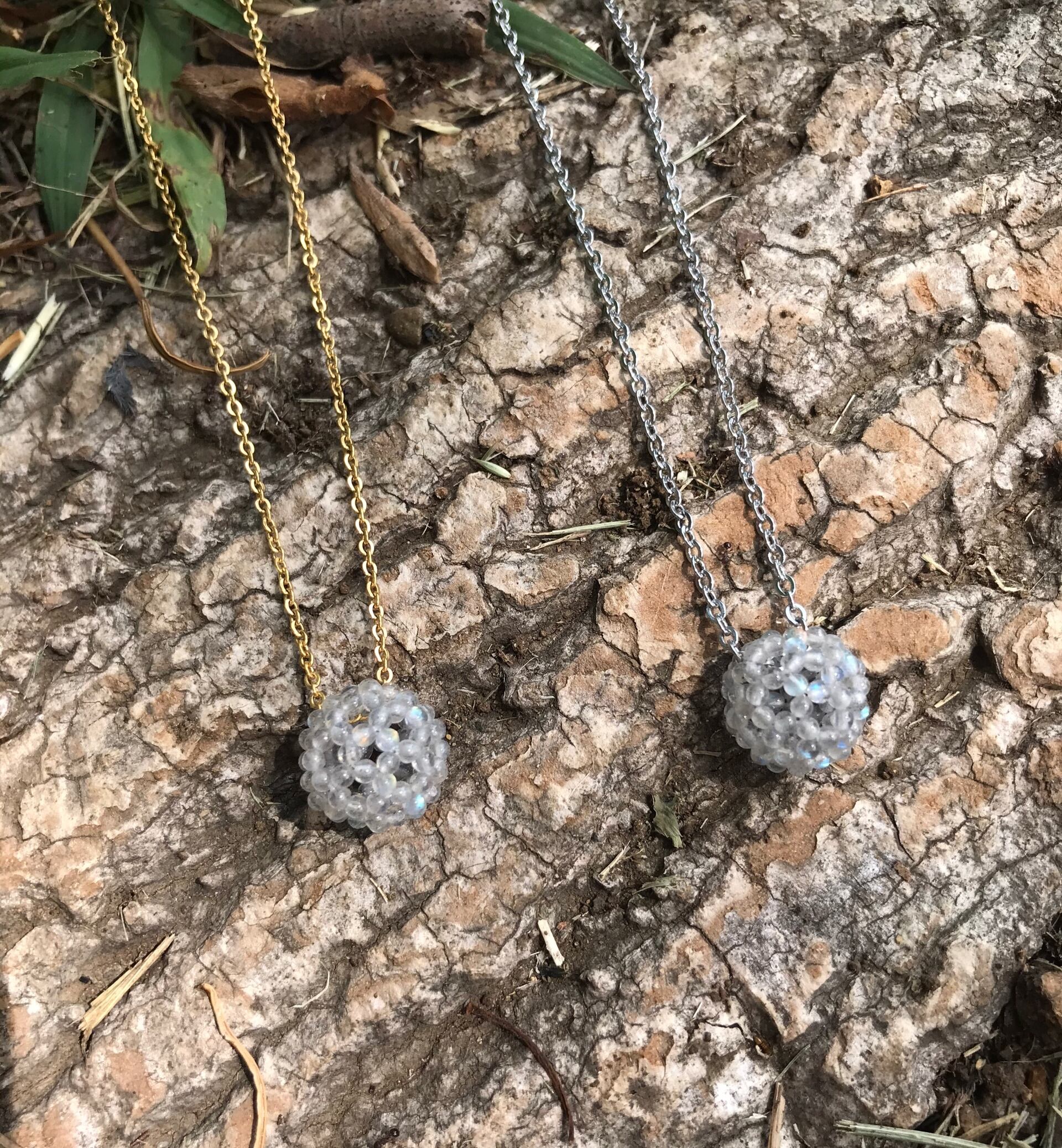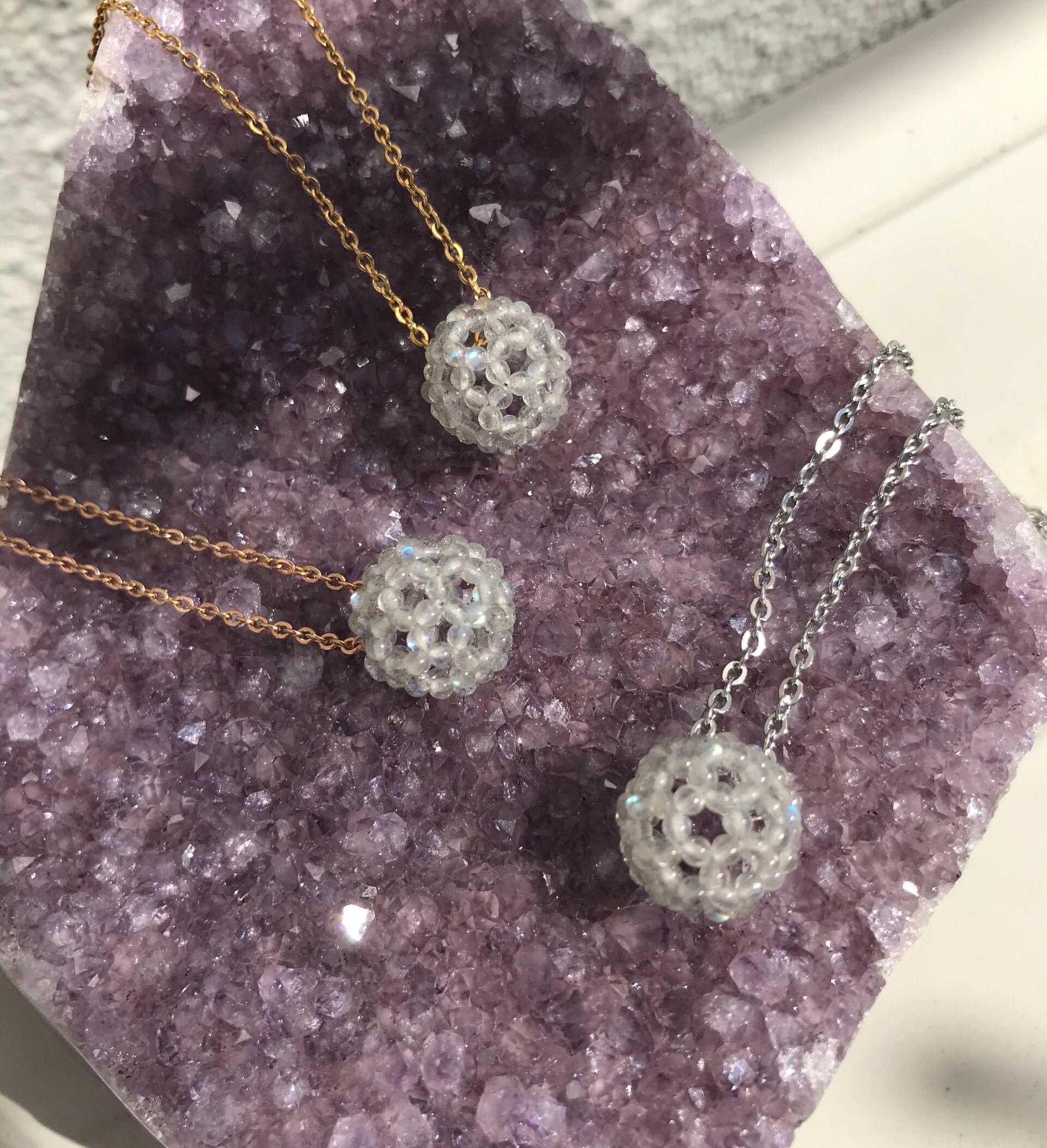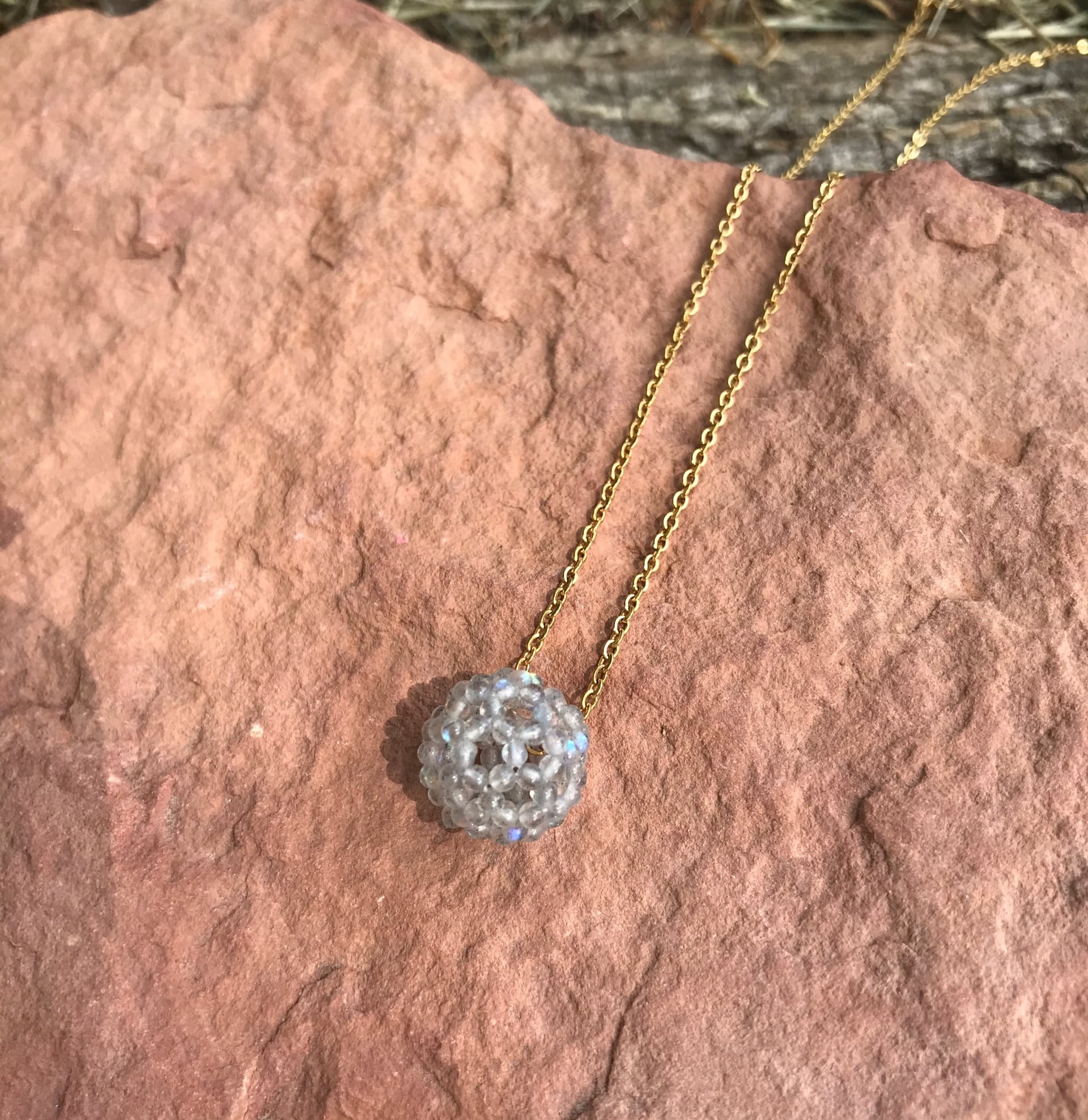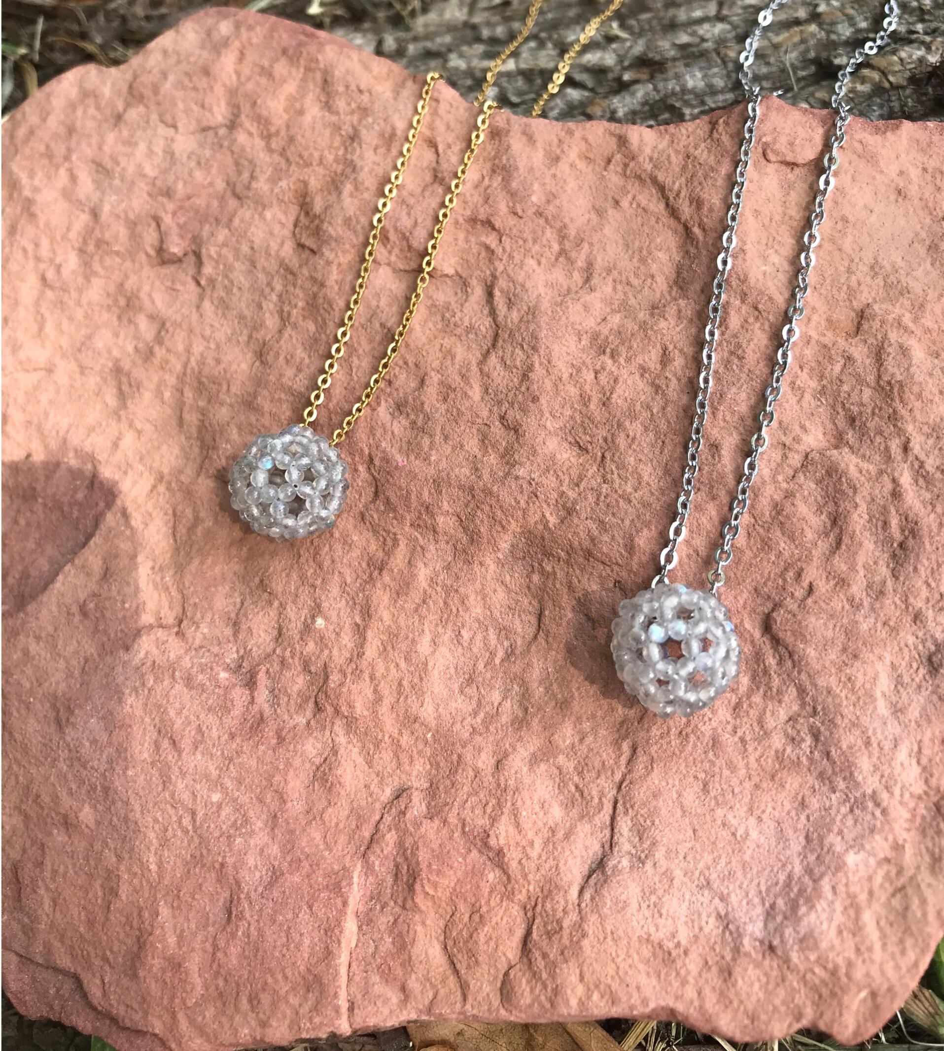 【宝石質ラブラドライトAAA極小ラウンド2.2mm】フラーレン・バッキーボール(ステンレス製チェーン・ゴールド)