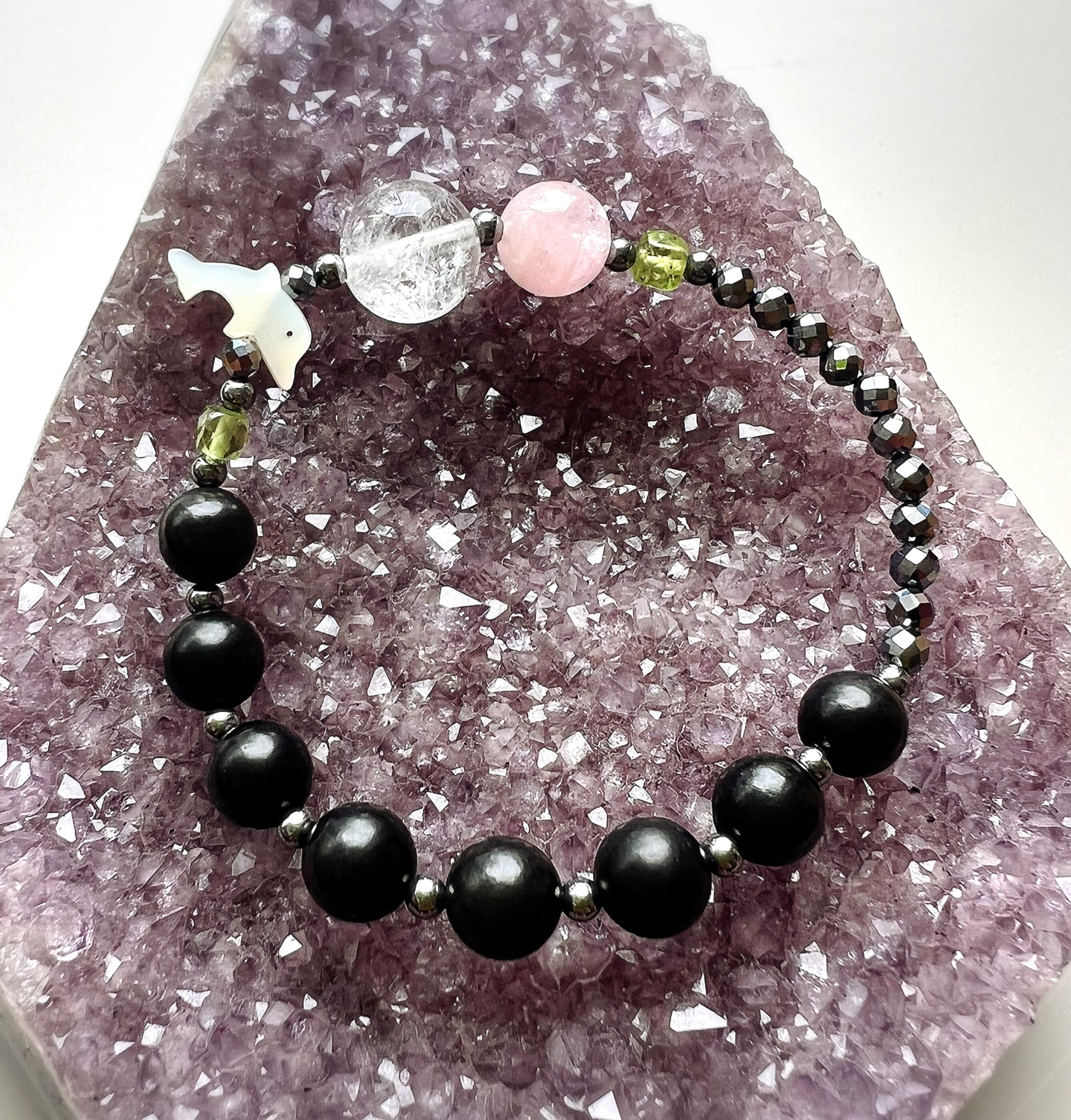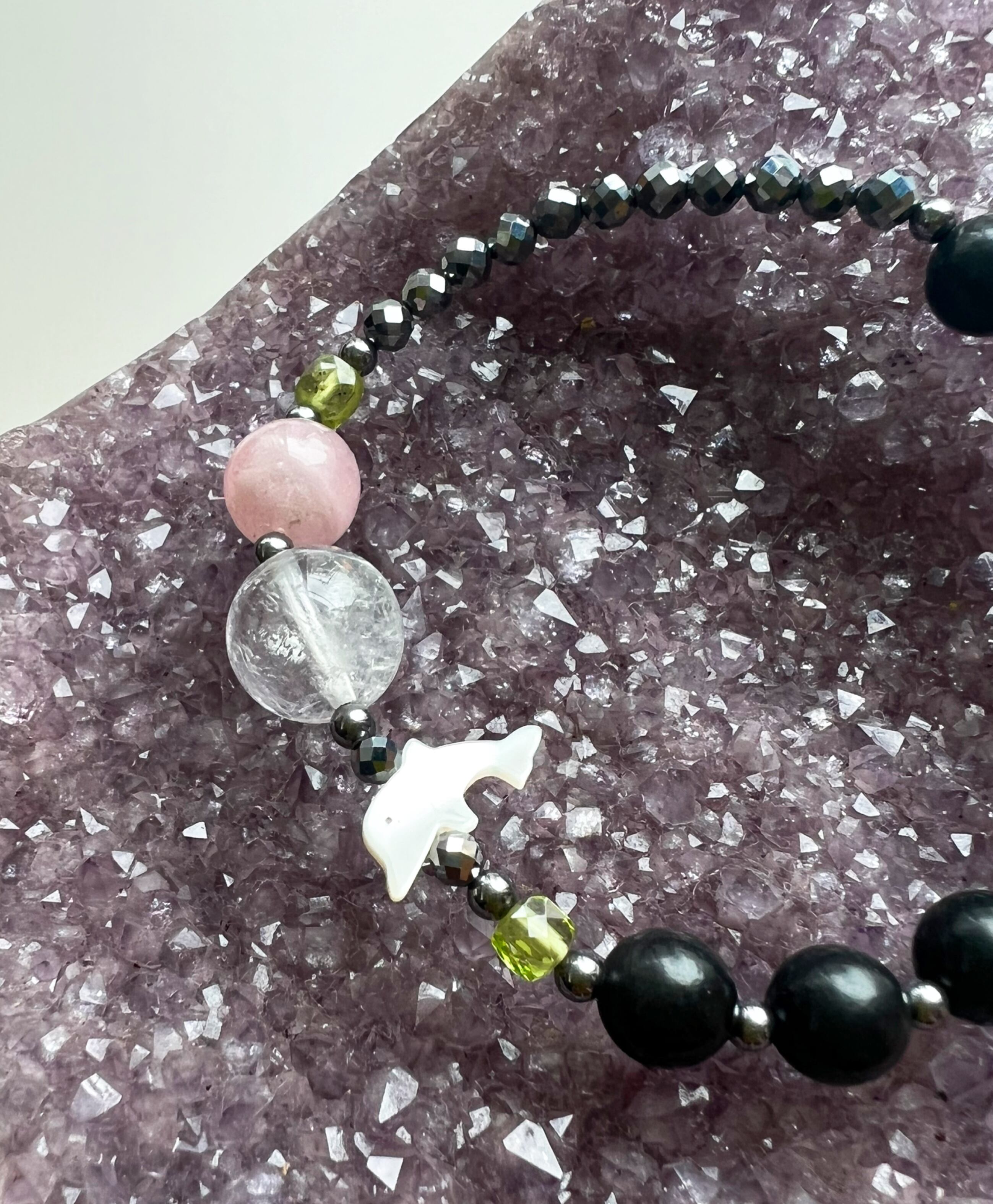 【4月の誕生石モルガナイト×ペリドット× イルカ(マザーオブパール)×ヒマラヤ産アイスクリスタル×シュンガイト×テラヘルツ】