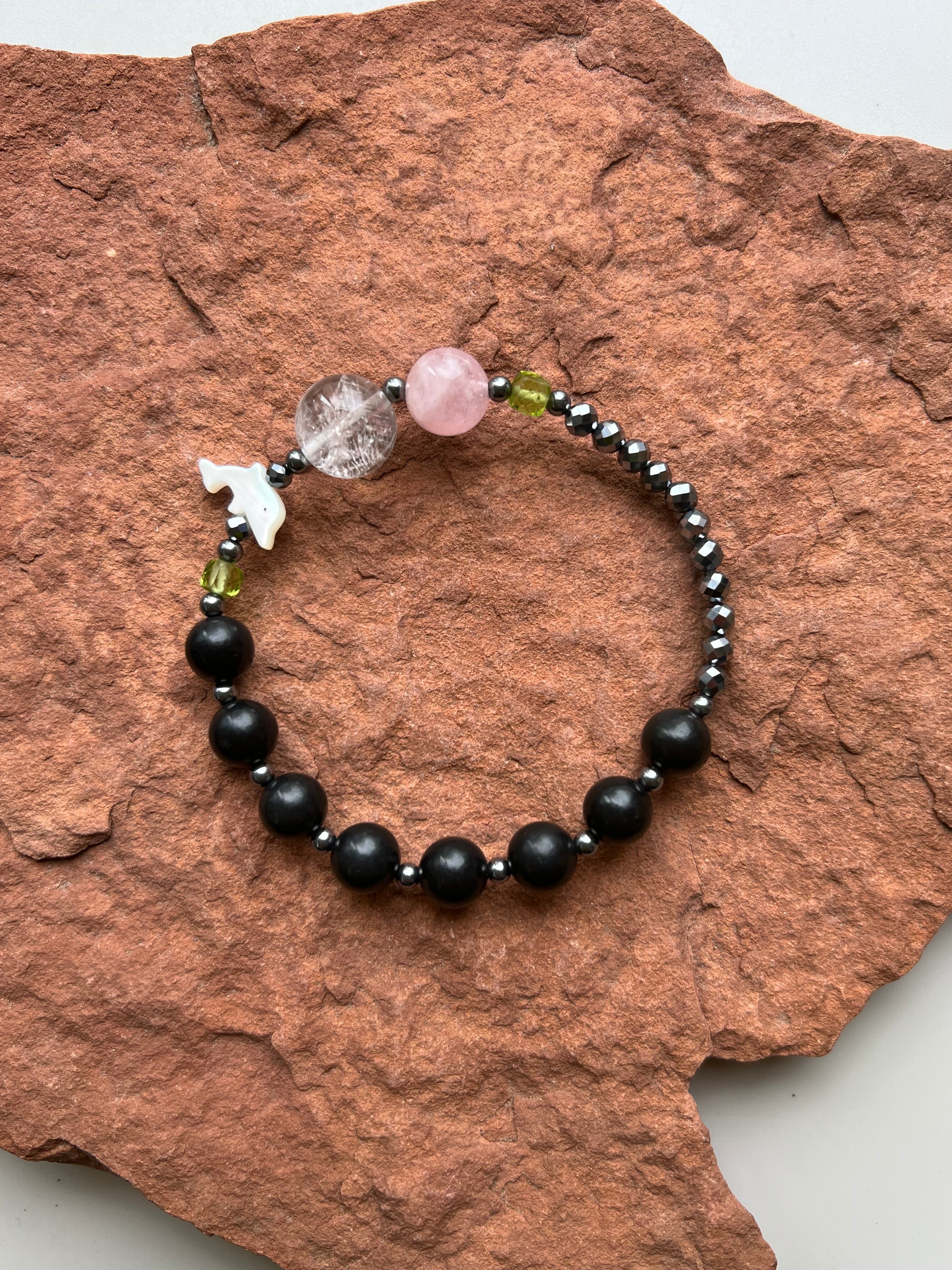 健康石としても大人気のテラヘルツ鉱石と、電磁放射線を遮る力があるといわれている希少石の「シュンガイト」を使用した『電磁波対策ブレスレット』です。
